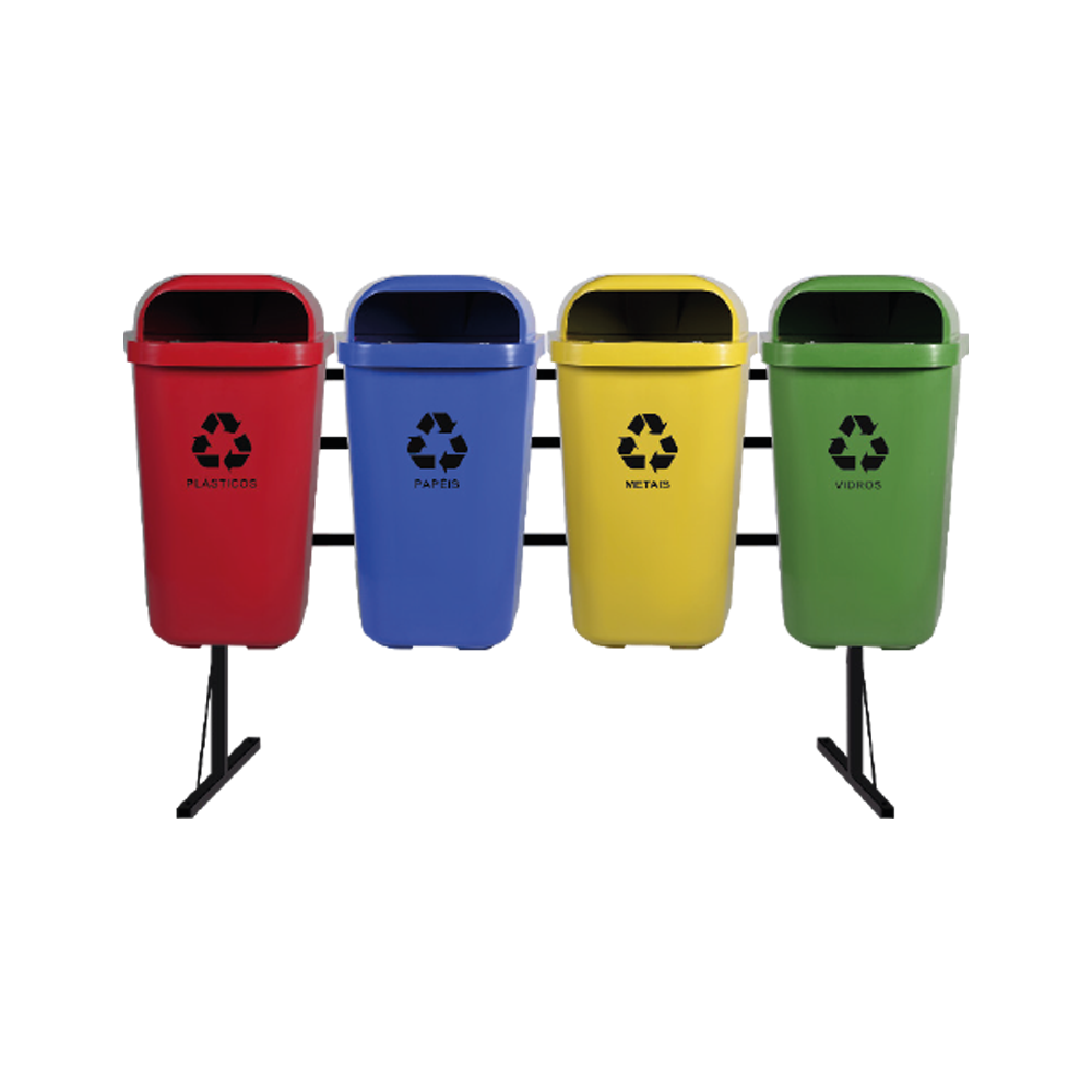 O kit é composto por 4 Papeleiras para Coleta Seletiva 50L – fabricado em Polietileno de Alta Densidade (PEAD) ou Polipropileno (PP).