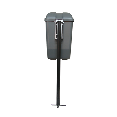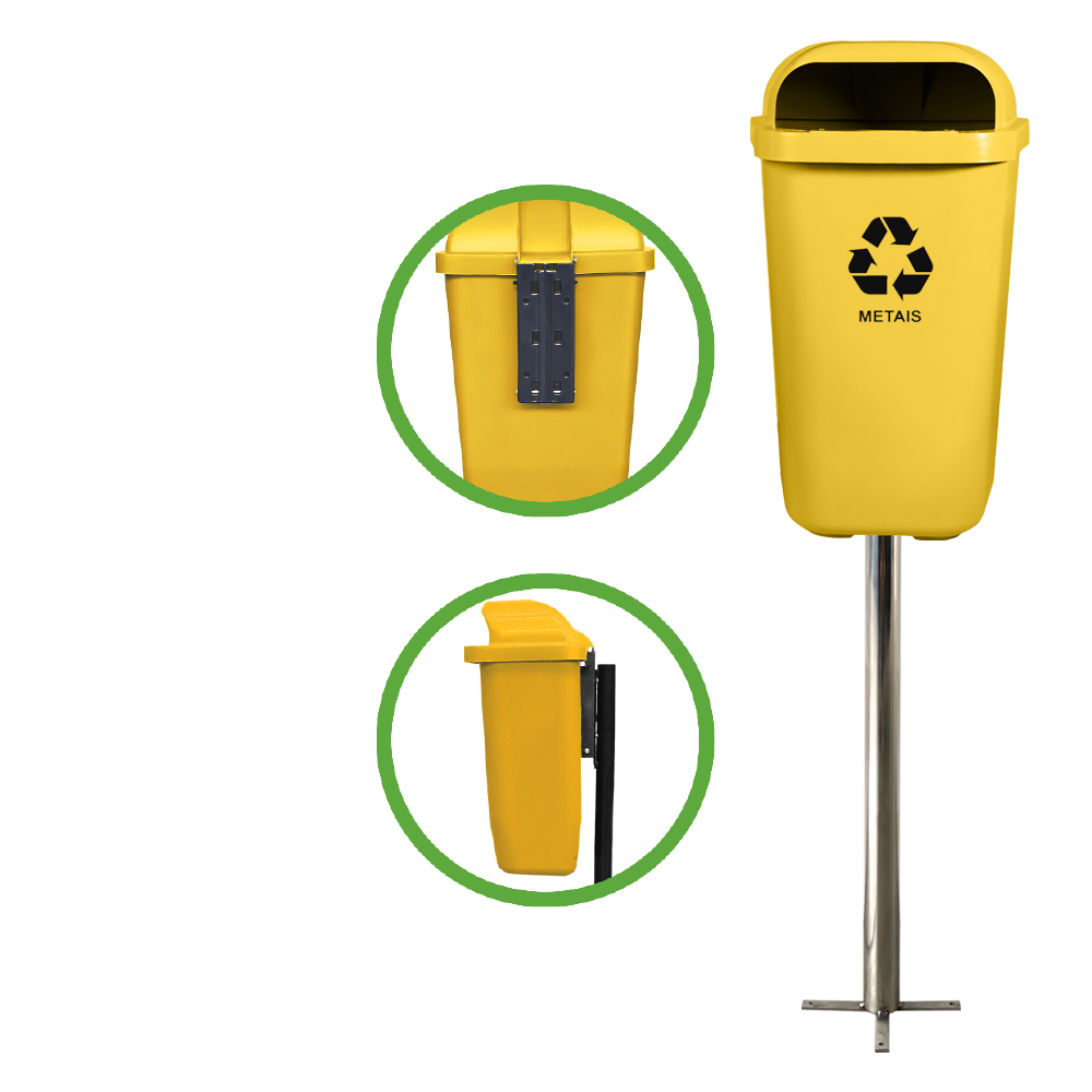 O conjunto acompanha um poste em aço galvanizado, conferindo estabilidade e resistência à corrosão. Para maior segurança e facilidade na manutenção, a lixeira possui um sistema inteligente de fechadura com chave: a tampa permanece fixa à estrutura enquanto o corpo pode ser removido facilmente para higienização e descarte dos resíduos, dispensando a necessidade obrigatória de sacos de lixo.